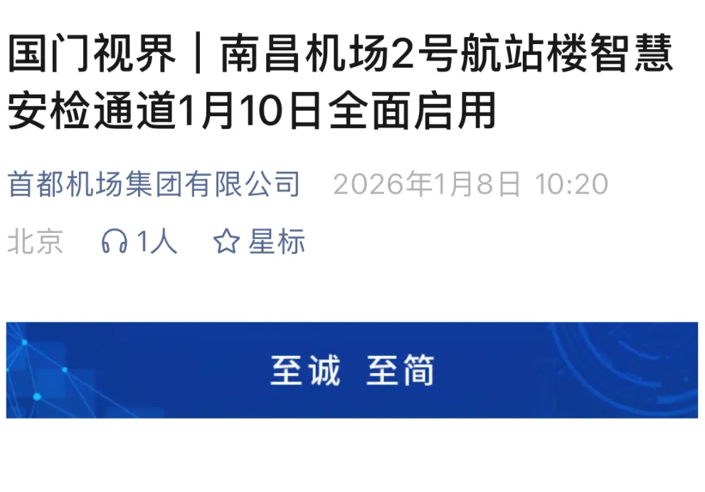 1月8日,首都机场集团自媒体平台发布《南昌机场2号航站楼智慧安检通道1月10日全面启用》视频。