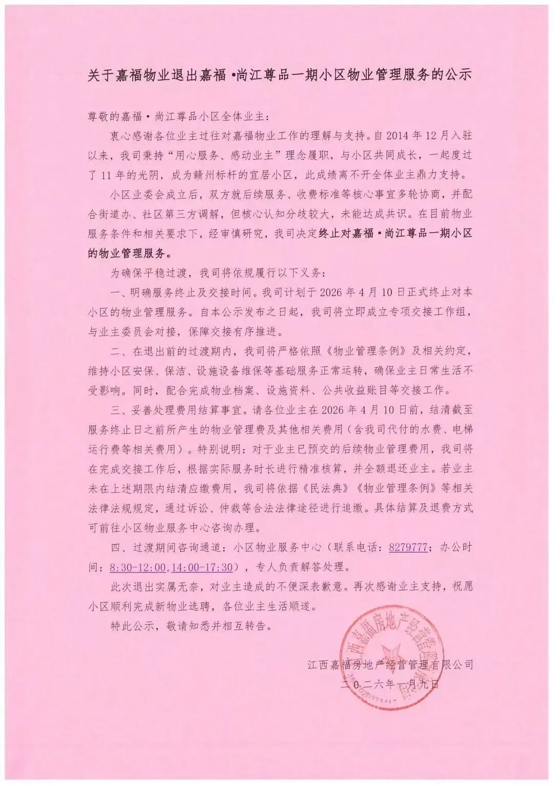 2026年1月9日,赣州嘉福物业发布《关于嘉福物业退出嘉福.尚江尊品一期小区物业管理服务的公示》,计划于2026年4月10日正式终止对赣州嘉福·尚江尊品一期的物业管理服务。