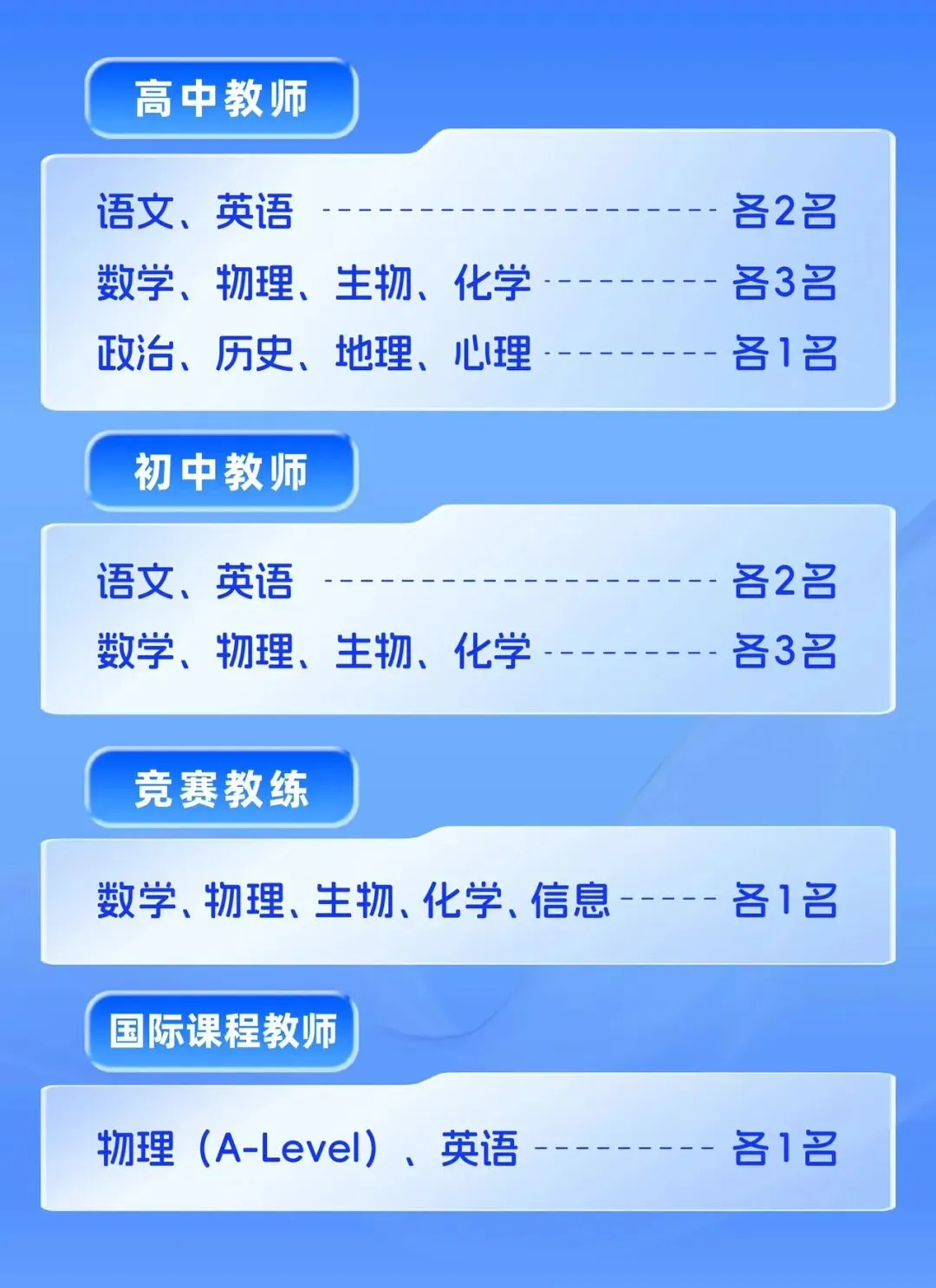 年薪15万-25万(博士/竞赛教练另议),子女入学全配套。教师享受六险二金(养老、医疗、补充医疗、失业、工伤、生育、住房公积金、企业年金)、带薪寒暑假、教师子女入学减免学费福利、年度体检、节日福利等完善待遇,免费营养餐、拎包入住的人才公寓、游泳馆、健身房、篮球馆、体育馆、图书馆全部免费向教职工开放使用,学校为优秀人才提供富有竞争力的薪资待遇。学校建立了完善的薪资福利体系、奖励与评价体系及教师的职级发展体系。