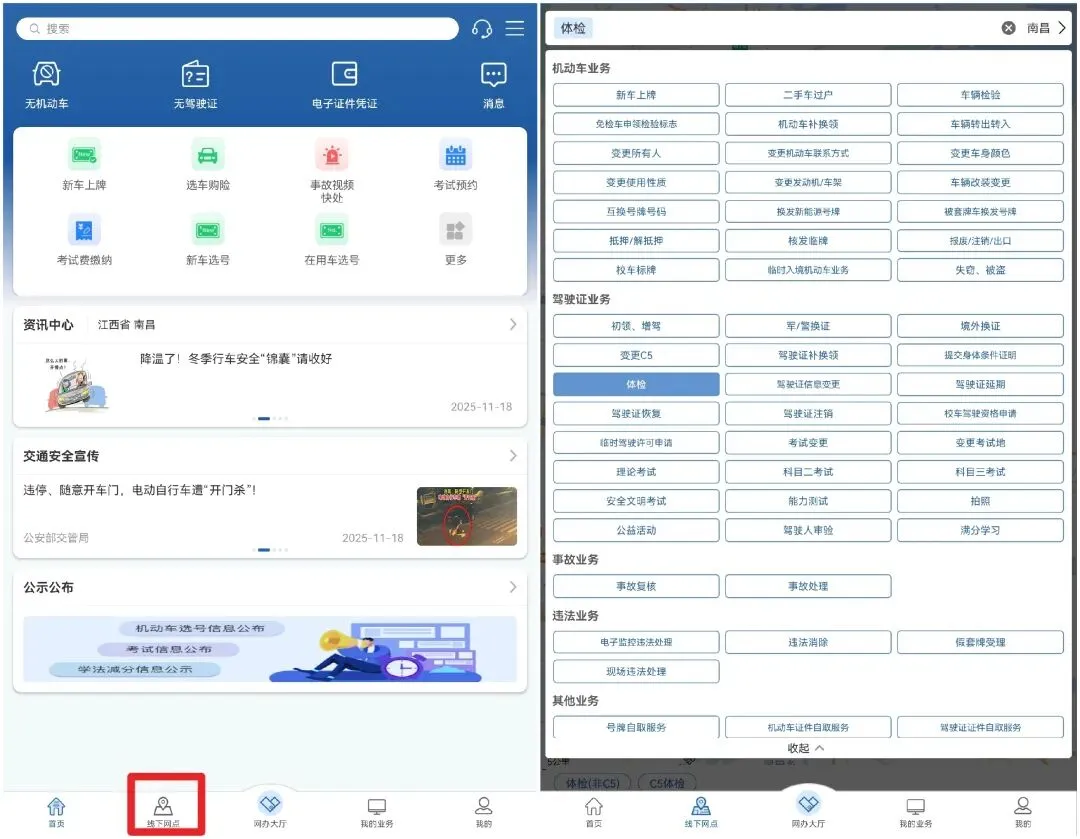打开“交管 12123”APP,点击“线下网点”,即可查询就近的体检地址。