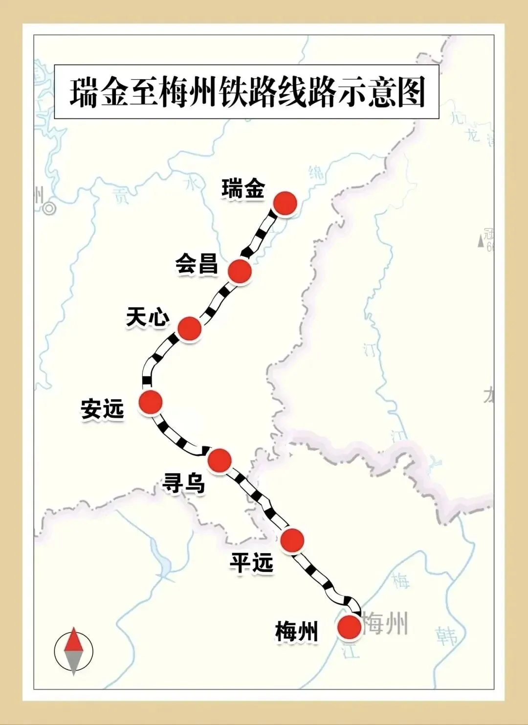 其中,江西段北起瑞金市,南至寻乌县省界,正线全长165.2公里,由既有赣龙铁路瑞金站引出,沿线设瑞金、会昌、安远、天心、寻乌5座车站,向南衔接广东梅州段,共同构成贯通赣粤两省的重要铁路通道。
