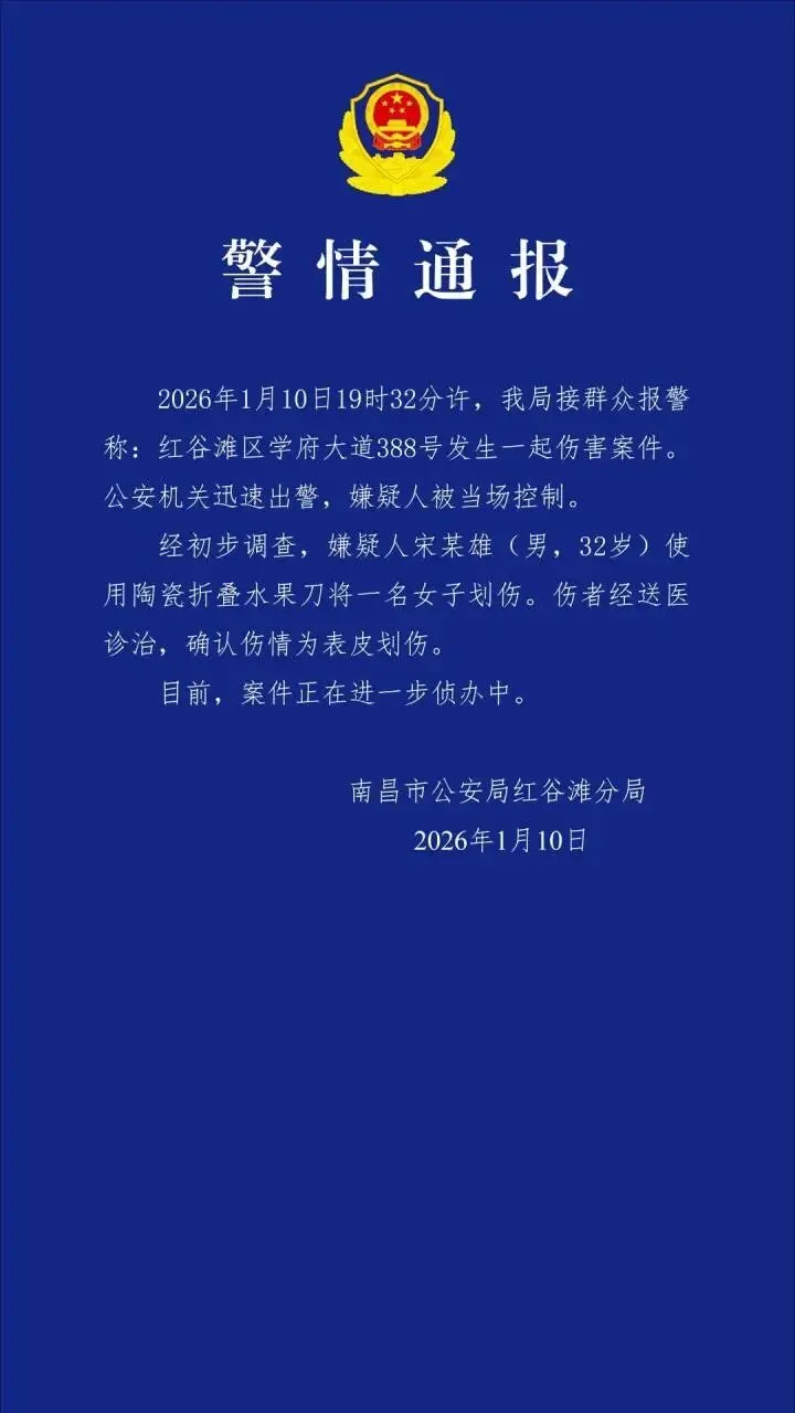 2026年1月10日19时32分许,我局接群众报警称:红谷滩区学府大道388号发生一起伤害案件。公安机关迅速出警,嫌疑人被当场控制。