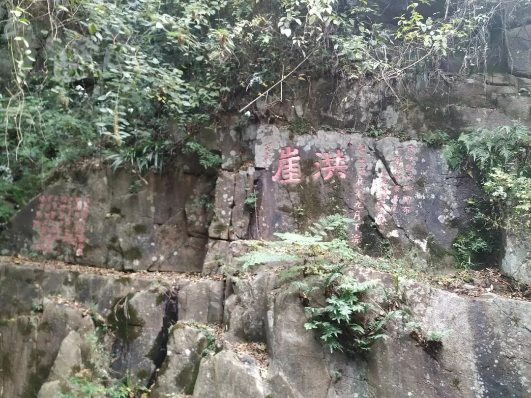 洪崖有摩崖石刻多处。现仍清晰可辨的有清朝康熙丙辰年笑堂白书刻的“洪崖” 两个大字, 闽长溪游起南题刻的对联:“两峡悬流联瀑布,一泓活水喷洪崖”,宋朝淳熙年间石刻:“海陵周次张、龚中,邺枚惟,以淳熙乙已(公元1185年)冬,携樽访药血,徘徊不觉暮矣。曝西日,掬清泉,相与乐而忘归。”