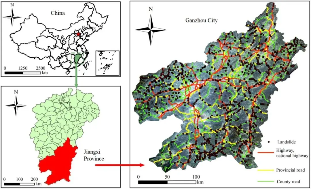 Fig. 4: 赣州市的地理位置、道路网络分布和滑坡分布。