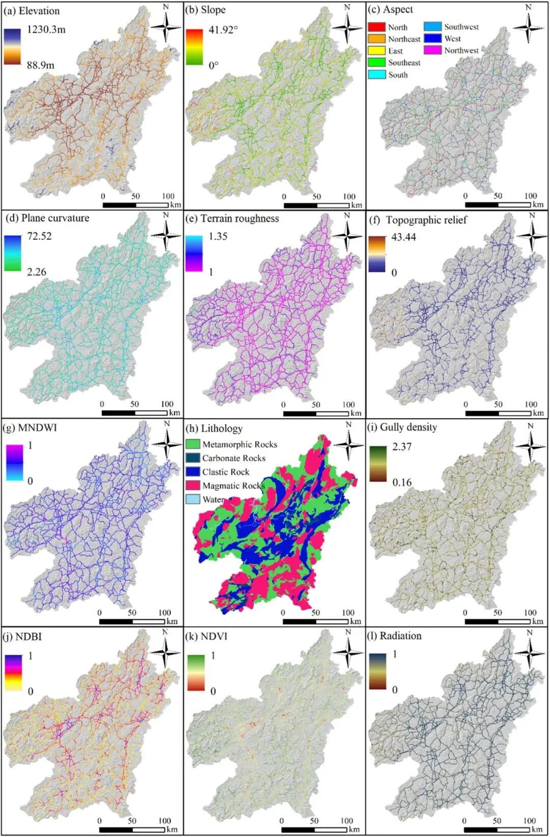 Fig. 7: 部分条件因素:(a)海拔;(b)坡度;(c)坡向;(d)平面曲率;(e)地形粗糙度;(f)地形起伏;(g)MNDWI;(h)岩性;(i)沟壑密度;(j)NDBI;(k)NDVI;(l)辐射。