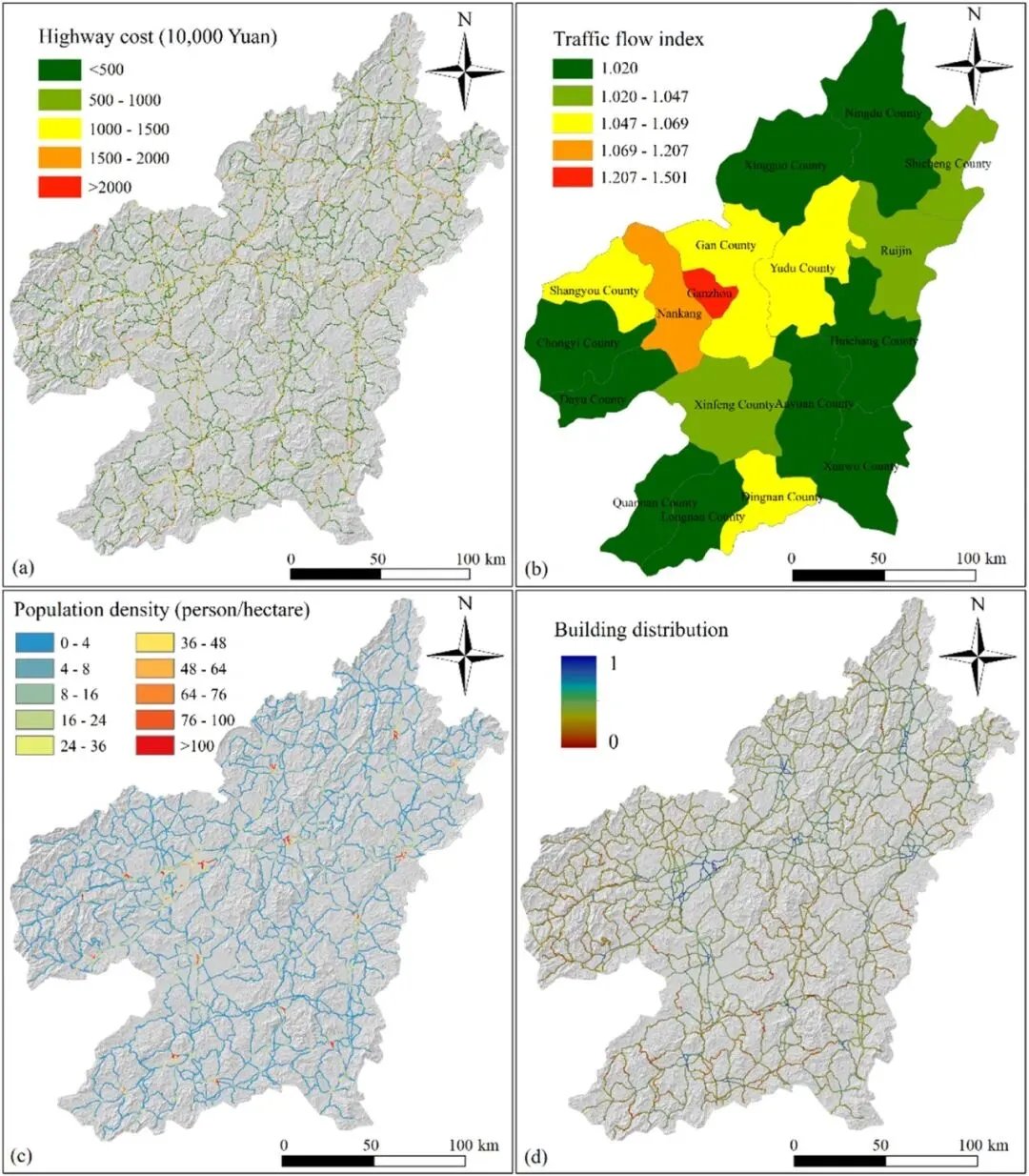 Fig. 8: 沿高速公路的灾害承载实体分布:(a)高速公路成本;(b)交通流量指数;(c)人口密度;(d)建筑物分布。