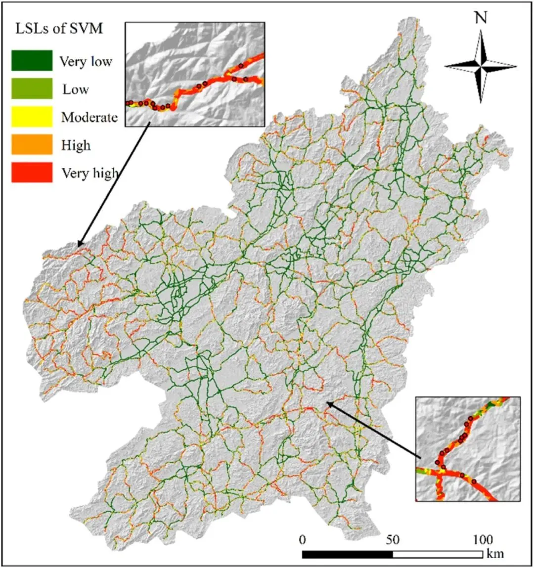 Fig. 11: 基于SVM 模型的道路网络滑坡易发性模型。LSL 表示滑坡易发性等级。
