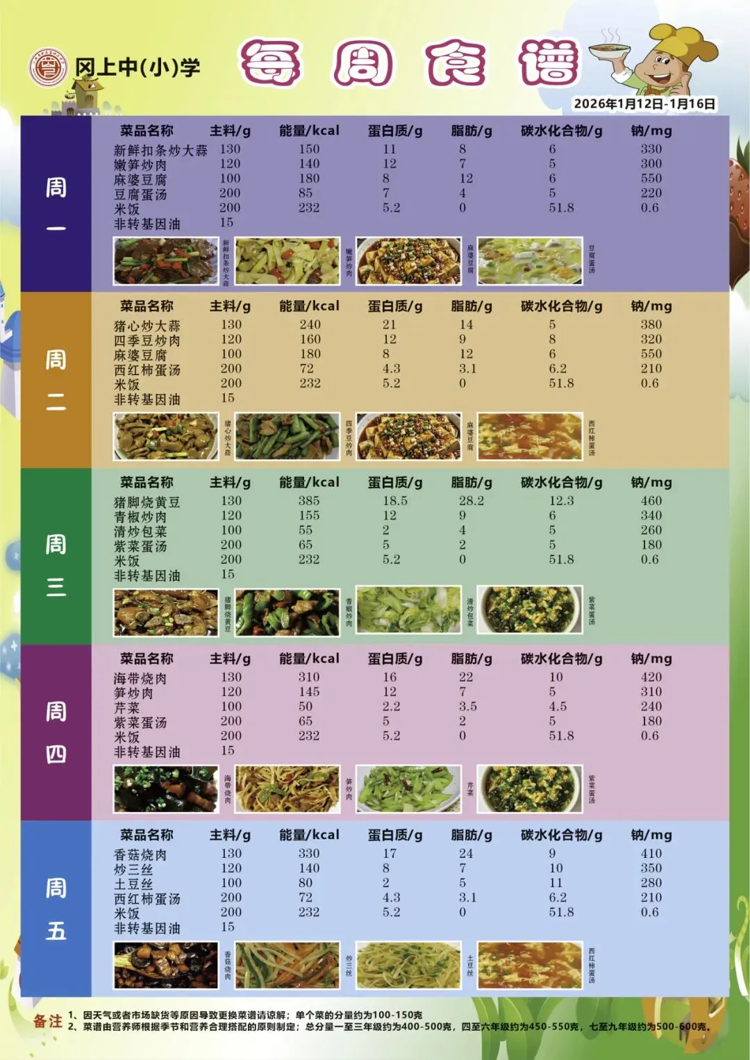 南昌县冈上中学每周食谱公示(1月12日—1月16日)