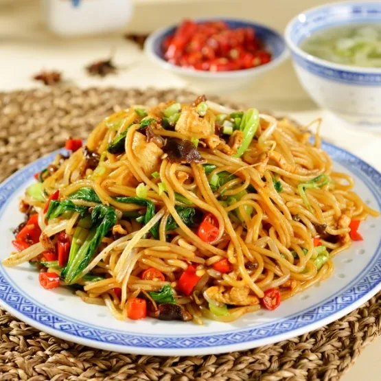 米粉提供碳水化合物,快速补充能量;猪肉丝富含优质蛋白,维持肌肉与组织修复;搭配的蔬菜(如青椒、豆芽)补充维生素和膳食纤维,促进肠道蠕动,实现能量与营养双补给。