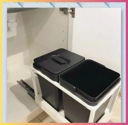 第一层放清洁用品,专门装洗洁精、钢丝球、海绵,分格摆得整整齐齐。第二层放厨房纸、垃圾袋、备用手套。第三层做成了隐藏滑轨垃圾桶,扔完手一关,看不见一点脏物。