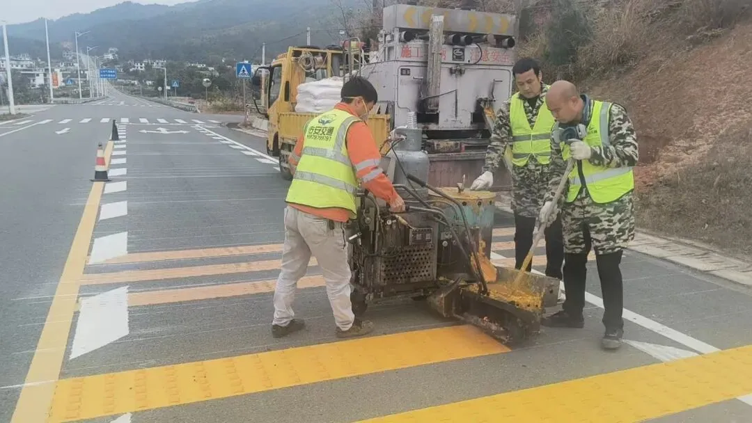 与此同时,在环一路和潭口至半坑乡道交界处,另一组养护人员正操作专业机械设备,忙碌地施划道路震荡标线,并增设、完善各类交通安全标识标牌。