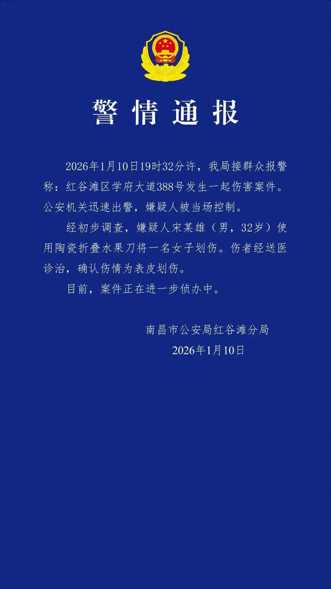 2026年1月10日19时32分许,我局接群众报警称:红谷滩区学府大道388号发生一起伤害案件。公安机关迅速出警,嫌疑人被当场控制。经初步调查,嫌疑人宋某雄(男,32岁)使用陶瓷折叠水果刀将一名女子划伤。伤者经送医诊治,确认伤情为表皮划伤。目前,案件正在进一步侦办中。
