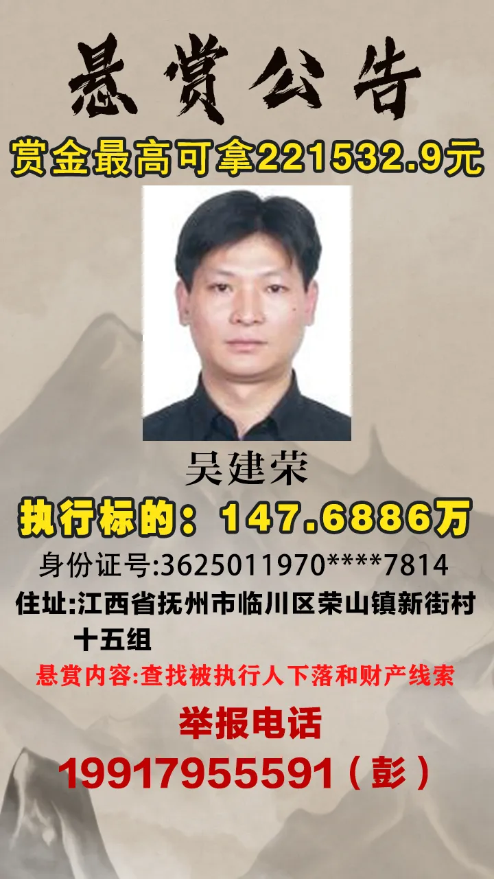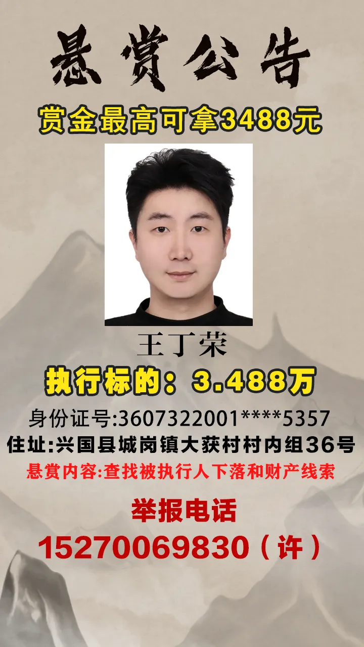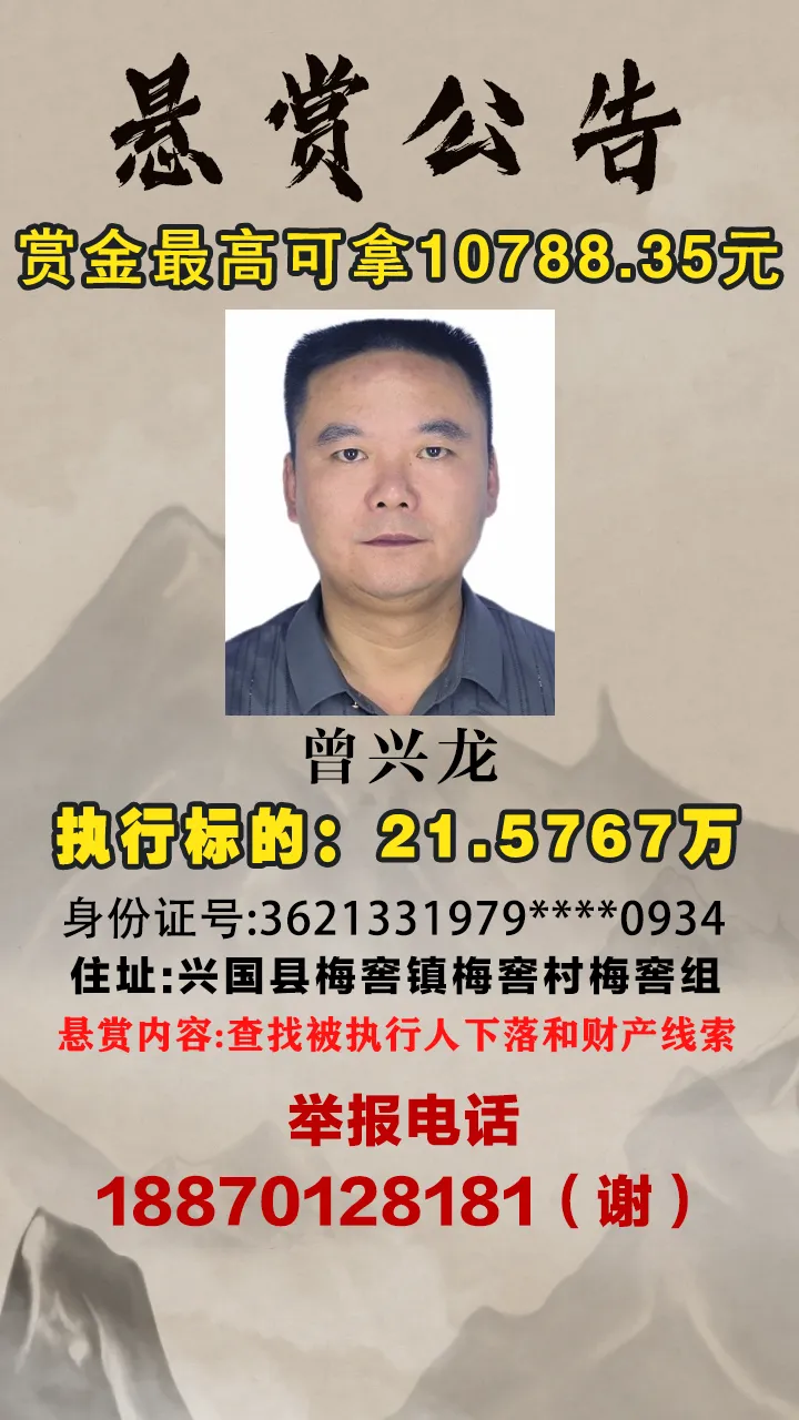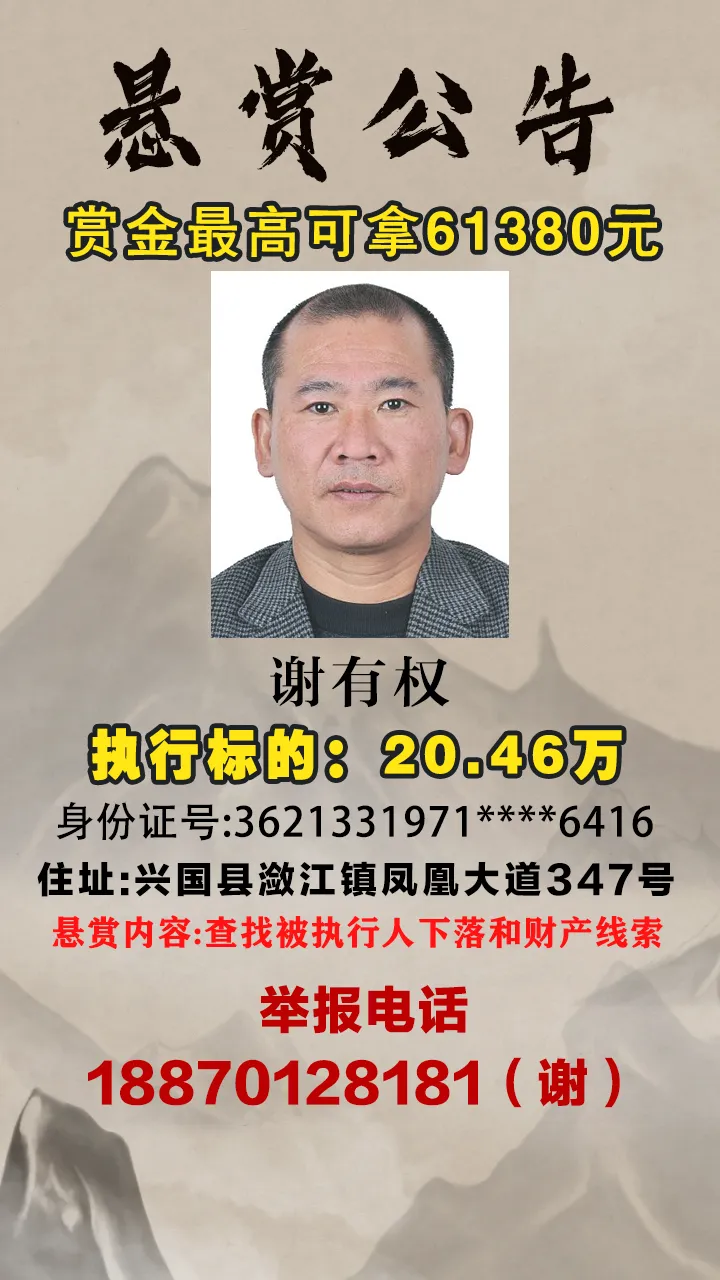 经申请执行人申请,近日,兴国县人民法院根据执行工作需要,公告悬赏查找以下6名被执行人下落及财产线索。凡经兴国县人民法院核实为有效线索的,将视情况一次性给予举报人执行到位金额的5%-30%不等作为赏金,并对举报人的信息严格保密。