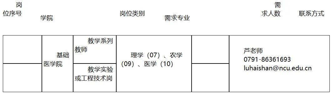 南昌大学是国家“双一流”建设高校、教育部与江西省部省合建高校、江西省一流大学整体建设高校。学校地处“英雄城”南昌市,拥有前湖、青山湖、东湖3个校区,其中前湖主校区占地面积4260余亩,校舍建筑面积149万余平方米。学校现有42个教学单位,13个学科门类、92个本科招生专业,27个博士学位授权一级学科,4个博士专业学位授权类别,18个博士后科研流动站;50个硕士学位授权一级学科,36个硕士专业学位授权类别。学校设有5所直属附属医院,共有16个国家临床重点专科。材料科学与工程学科入选国家“双一流”建设学科,6个学科入选省一流学科。17个学科进入ESI全球排名前1%,其中农业科学(以食品科学为主)进入全球排名前0.299‰;食品学科在“US News全球大学学科排名”中位居第8位。迈入新征程,展现新作为。南昌大学将坚持以立德树人为根本,深入实施“需求牵引、特色发展、开放办学、人才强校、文化铸魂”五大战略,扎实推进“一流学科攻坚、人才培养创优”等十大行动,全面开启“江西底色中国特色的世界一流大学”建设新征程,努力打造“特色学科、科技创新、人才集聚”三个高地,奋力成为“拔尖创新人才自主培养、地方大学服务区域发展、革命老区建设世界一流大学”三个样板,当好江西高校“领头羊”,为服务教育强国和科教强省战略作出新的更大贡献!详情请见:http://www.ncu.edu.cn南昌大学基础医学院(School of Basic Medical Sciences, Jiangxi Medical College, Nanchang University)始建于1934年,前身是江西医学院基础医学部。九十一年来,学院学院薪火相传、赓续奋进,始终坚持“教育为本,立德树人”理念,不断提升办学水平,为国家培养了大批基础医学类人才。学院下设5个系、11个教研室、1个卓越医学教学团队、1个省级示范性实验教学中心。现有教工152名,其中专任教师113名,实验技术人员27人。博士学位教师占比72%,海外一年以上留学经历占比37%以上。博士生导师 40人,硕士生导师83人。学院承担了临床医学、麻醉学、预防医学、检验医学、药学等13个专业的基础医学教学和医学类本科生科研训练,为学校医学人才培养提供强力支撑。详情请见:http://sbms.ncu.edu.cn应聘人员应坚持正确政治方向,拥护中华人民共和国宪法,拥护中国共产党领导和社会主义制度,贯彻党的路线方针政策,忠诚和热爱党的教育事业,践行社会主义核心价值观,遵守职业道德、法律法规和学校相关制度。招聘条件:招聘人数不限;具有较强学术组织力,在所在学科内取得国内领先或世界先进水平的有影响力的成果、较好的学术成就;学术思想活跃,对学科发展具有创造性构想,能够带领所在学科进入国内领先地位,并在学科前沿领域冲击国内领先、国际先进水平。招聘条件:招聘人数不限;具有较强团队组织力,在所在学科(专业)方向取得重要的代表性成果,具有较好的学术竞争力和较大发展潜力;具有做好学科方向发展规划的能力,对本学科建设和学术研究工作有创新性构想。招聘条件:招聘人数不限;具有较强学术能力,在本学科内具有影响力的代表性成果;具有发展潜力,对本学科建设具有创新性构想,具有支持本学科保持或冲击国内先进水平的潜力。一般应具有国内外知名高校或科研院所博士后(2年及以上)经历,并有主持国家级科研项目经历。新聘人员和学校签订的聘用合同准聘期为6年,通过聘期考核签订续聘合同。以上岗位均为专业技术岗,要求应聘人员具有博士学历、学位或正高职称。为各类人才提供富有竞争力的薪资待遇,丰厚的科研启动经费,提供高水平的实验平台及科研环境,具体一人一议;提供人才住房一套或购房补贴,妥善安排配偶工作,为子女提供幼儿园至高中的一条龙优质教育资源,学校附属三甲医院提供优质的医疗保障服务。招聘工作按照报名、考核、体检、考察、公示、聘用等程序组织实施。本招聘计划2025年全年实施,招满为止。自公告发布之日起至少10个工作日后,由用人单位根据报名情况,不定期组织考核,组织考核人数不受最低开考比例限制。2.报名方式:凡有意应聘者,将简历发至用人单位及人事科邮箱。3.注意事项:①应聘者将详细个人简历、《南昌大学全职引进高层次人才推荐表(2025年新版)》(详见附件)、有关业绩材料及三封推荐信一道制成压缩包后上传,每个压缩包大小不宜超过5M;②投送要求:邮件主题及附件请注明:毕业院校、姓名学历、所学专业、拟应聘学院及具体岗位(例如:某某大学+王某某博士后+中国语言文学专业+应聘人文学院学科优秀人才岗位);③请应聘者认真如实填写和提交相关材料,若因提供材料不实所引发的后果,由应聘者本人负责。各用人单位根据需要采取一种或多种形式进行考核,并提供代表性成果送同行专家外审,依据外审结果,报学校审批后择优录取,考核时间、地点由用人单位另行通知。1.根据考核结果,按岗位招聘人数1:1的比例择优确定体检人员。2.在我单位指定的地点进行体检,检查标准参照《江西省教师资格申请人员体检办法(修订)》(赣教规字〔2021〕3号)和学校相关规定执行,应聘者应身心健康。对体检合格者进行考察,全面了解考察对象的政治素质、道德品行、工作能力、遵纪守法、廉洁自律、学习工作表现、身心健康等情况。经考核、体检合格,报学校审批通过后,用人单位将拟录用人员基本情况、岗位等相关信息