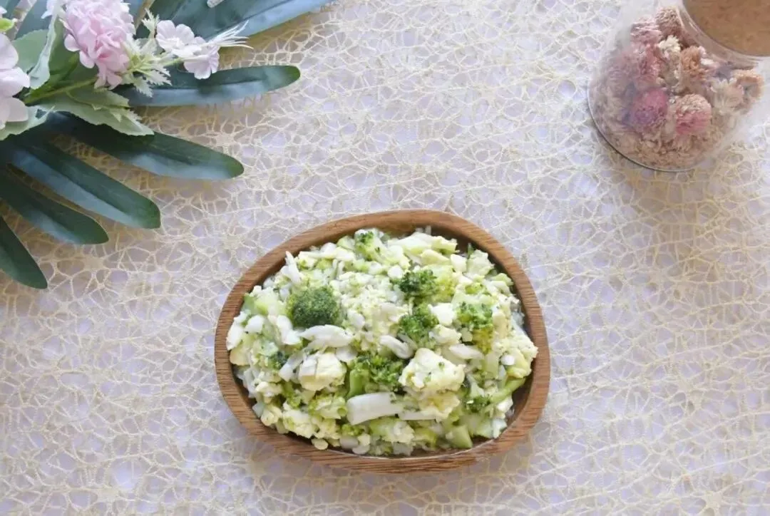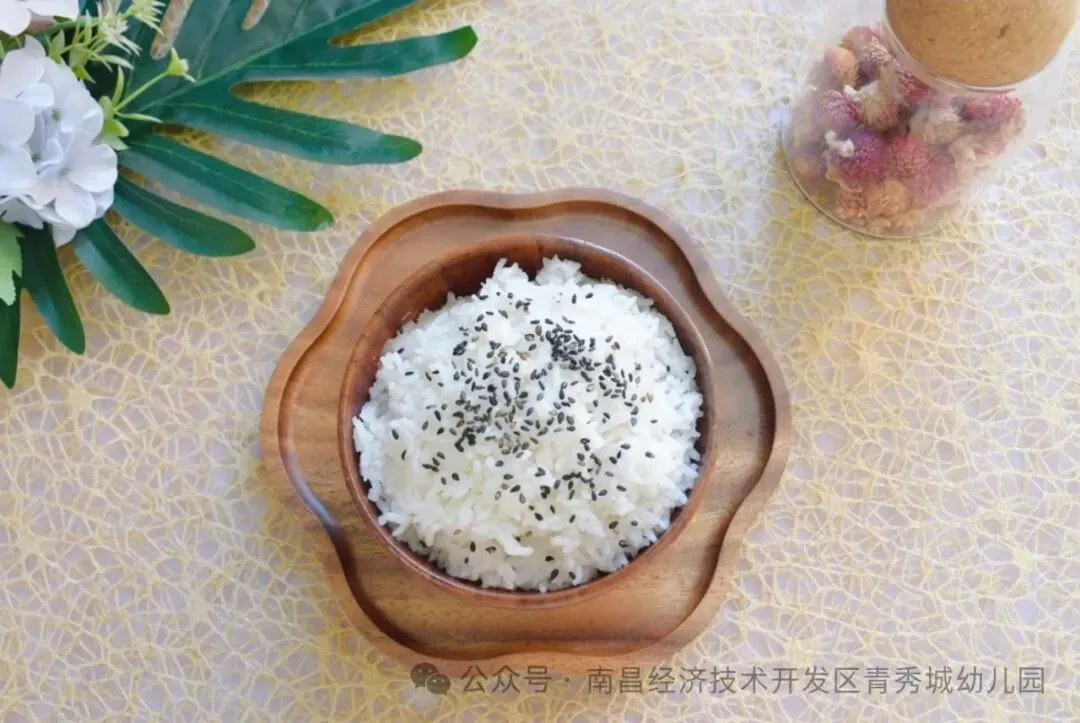 西兰花鸡蛋炒白玉菇、黄芽白烧肉丸、时蔬肉末蛋花汤、黑芝麻香米饭