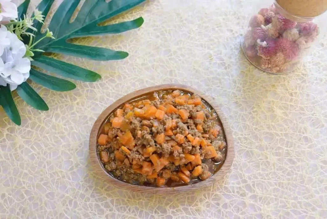 胡萝卜焖牛肉、麻油包菜、肉末鸡蛋羹、燕麦(山姆)香米饭