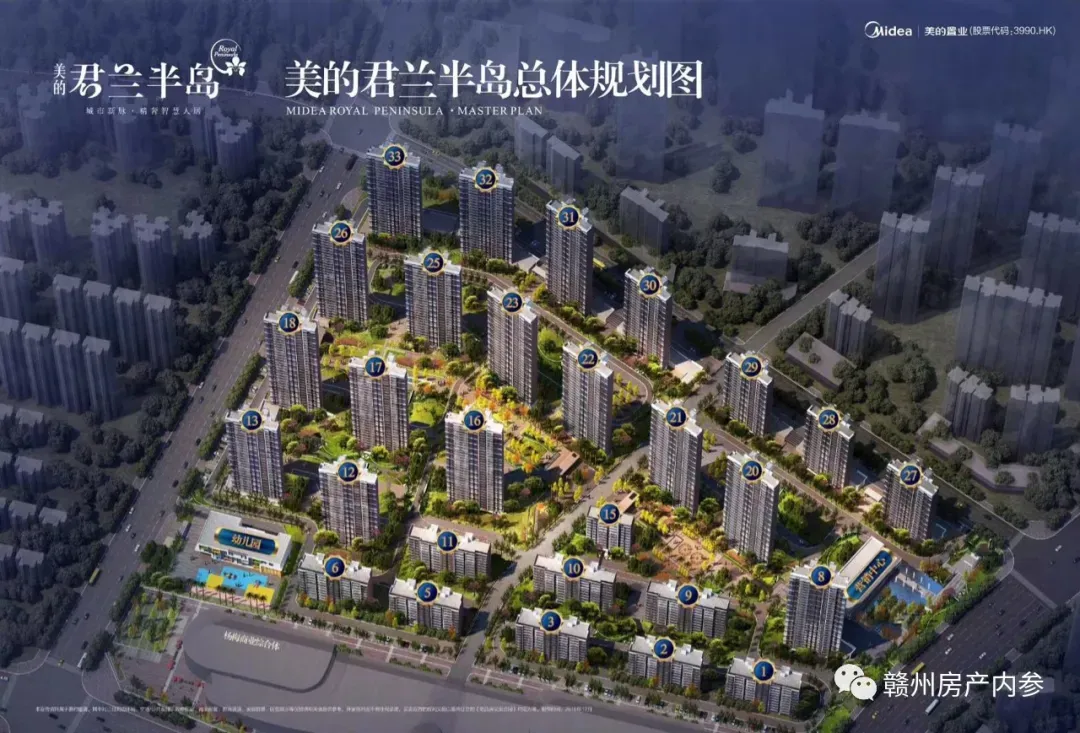 美的君兰半岛位于经开区东江源大道与香江大道交汇处,距离金凤梅园和万达广场不远。项目由 19 栋 21-33 层高层、9 栋 11 层洋房和 1 栋社区幼儿园组成。项目总占地面积 120000㎡、建筑面积 380000㎡、容积率为 2.5、绿化率 35%、共 2542 户、停车位 2518 个,由美的物业提供物业服务。