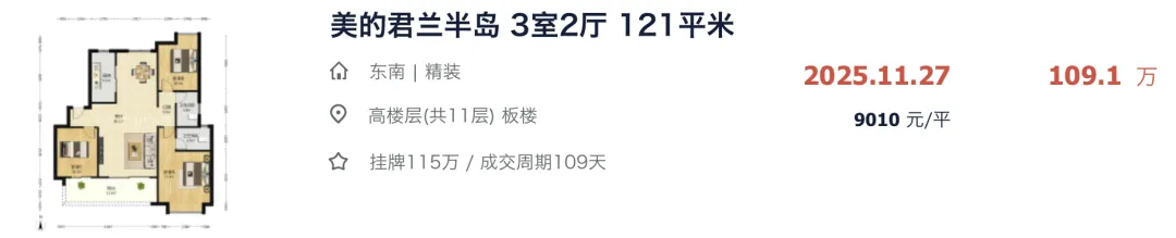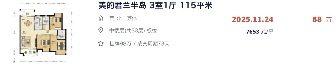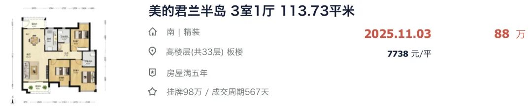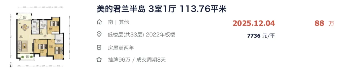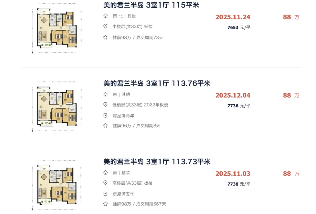 就在去年 11-12 月这段时间,美的君兰半岛连续卖了 3 套户型一样的房源,最快挂牌 8 天火速成交,成交价全部都跌到了 7 字头,刷新小区历史最低成交纪录。