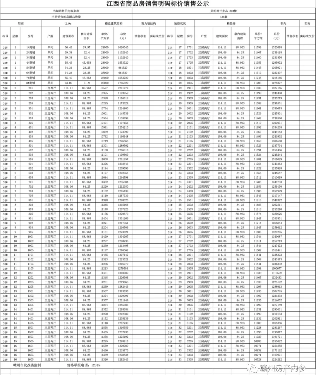 ▲ 赣州美的君兰半岛3套最低成交单价房源,高层旧规户型,公摊大布局也一般以小区历史最低价卖房,房东肯定是割肉离场。查阅小区的开盘信息可知,美的君兰半岛 115㎡ 户型 2021 年开盘时,备案均价要一万一左右一平,中间楼层单价差不多要 11500 元/㎡ 上下。现在以 7 字头成交,价格回落的确实很明显。