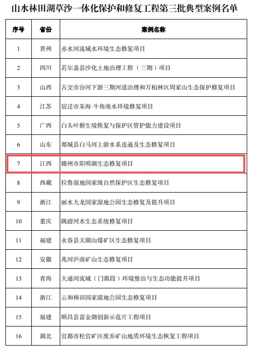 图为山水林田湖草沙一体化保护和修复工程第三批典型案例名单。