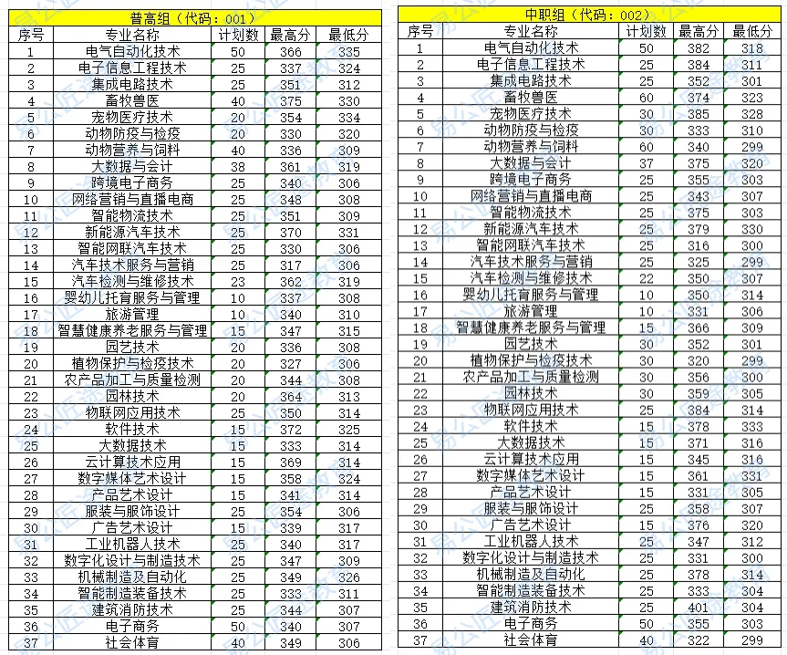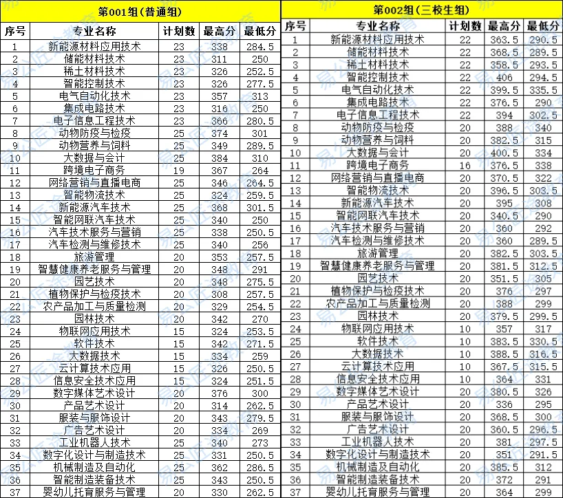 采用“分数优先、遵循志愿”原则,从高分到低分择优录取考生。第001组普通组最低录取控制线为250分,第002组三校生组最低录取控制线289.5分。各专业录取分如下: