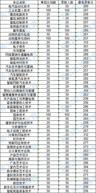 采用“分数优先、遵循志愿”原则,从高分到低分择优录取考生。普通单招最低录取控制线为256分。各专业录取分如下: