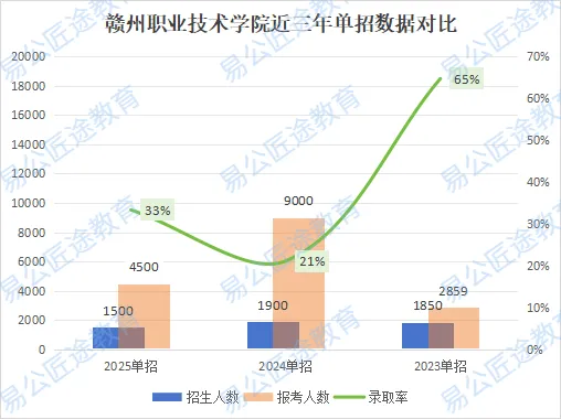 从招生规模看,赣州职业技术学院近三年单招招生人数都在1500人以上,报考人数则差别较大:2024年报考人数最多,共有9000人报考,录取率为21%左右;2025年报考人数略有回落,共4500人报考,录取率为33%左右。