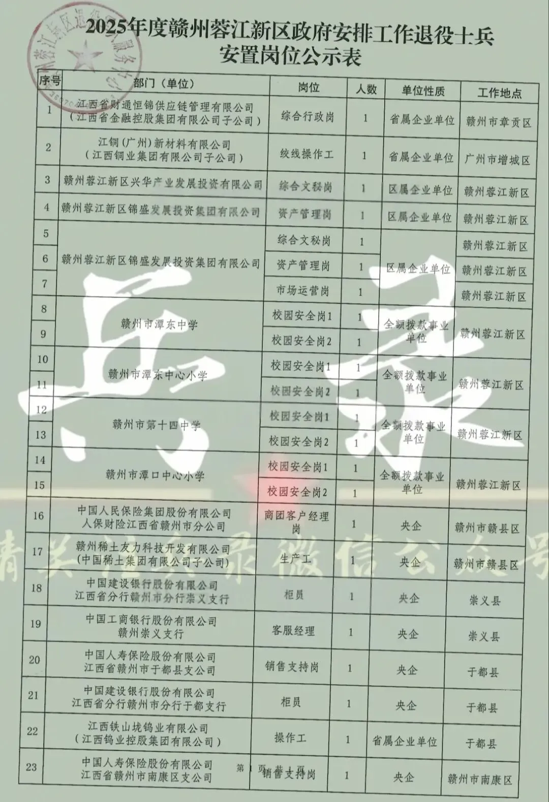 【江西省赣州市蓉江新区】2025年度符合政府安排工作退役士兵安置岗位公示