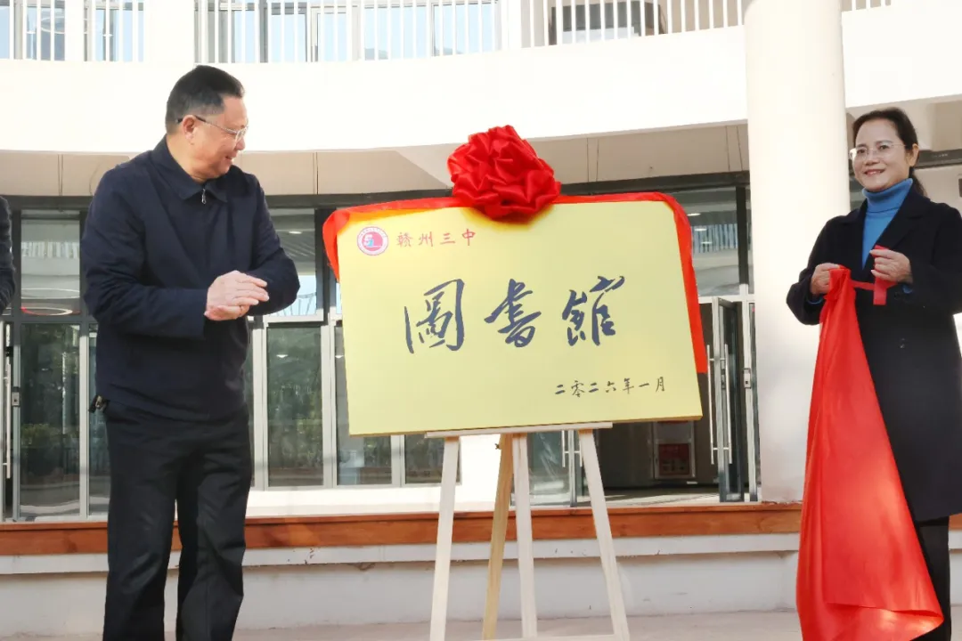 在热烈的掌声中,罗书记与戴校长共同为赣州三中赞贤路校区图书馆揭牌。红色绸布缓缓落下,标志着这座崭新的知识殿堂正式向师生开放。