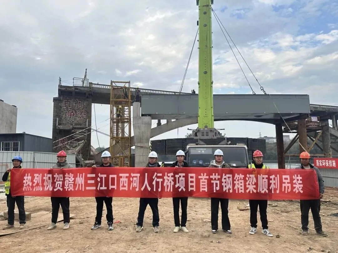 近日,随着一片重达71.6吨的钢箱梁精准吊装至指定位置,赣州三江口西河人行桥项目首片钢箱梁成功吊装,为后续桥梁钢箱梁连续建设和桥梁合龙奠定了坚实的基础,冲刺节前贯通目标。