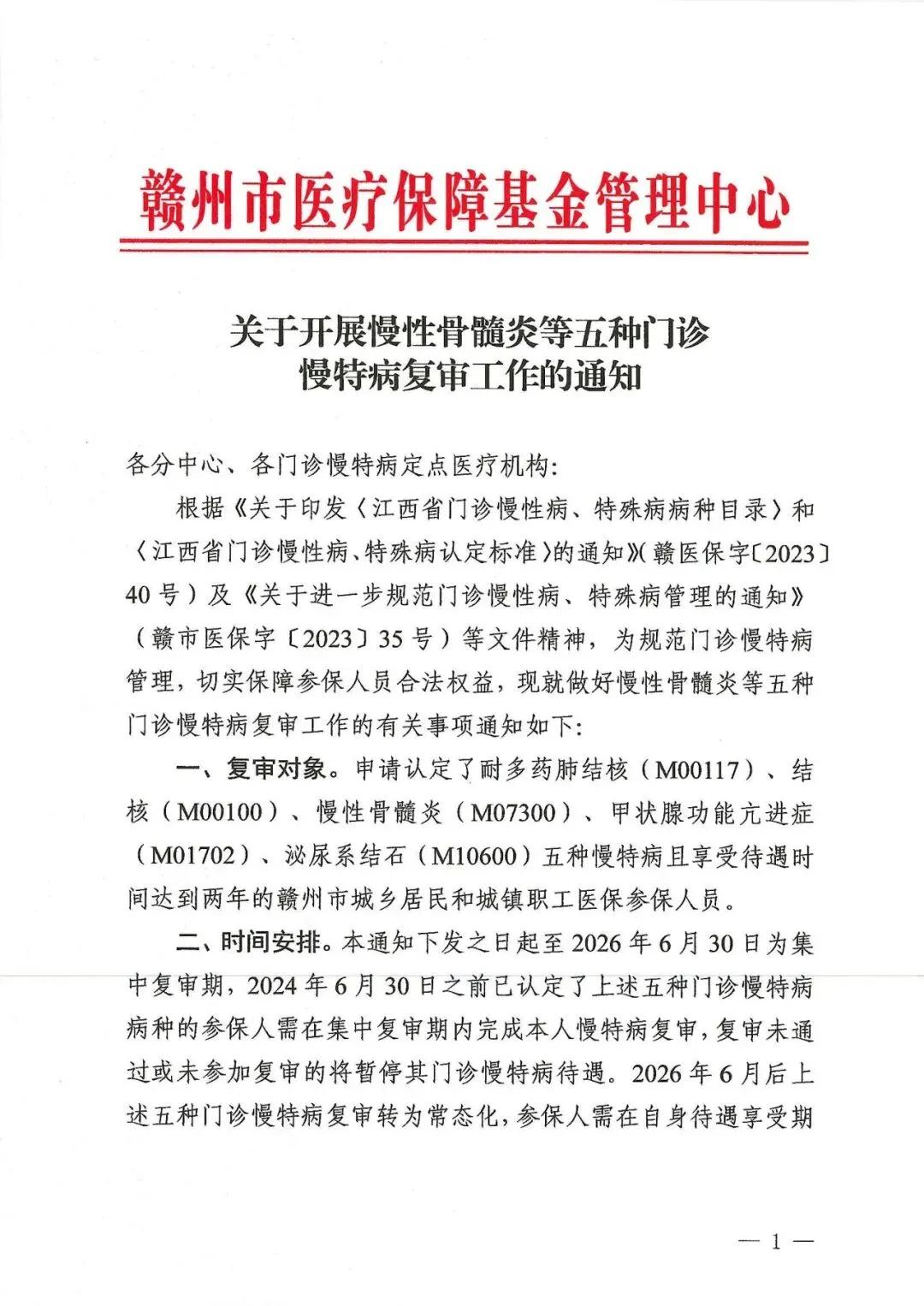 根据《关于开展慢性骨髓炎等五种门诊慢特病复审工作的通知》文件要求,现启动以下五种门诊慢特病的复审工作,对象为待遇享受时间满两年的赣州市城乡居民、城镇职工医保参保人员,具体病种如下: