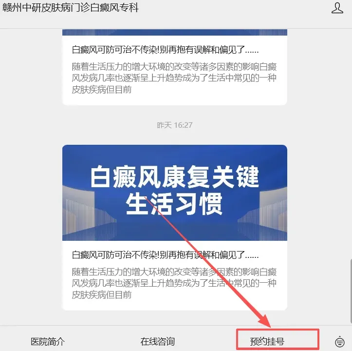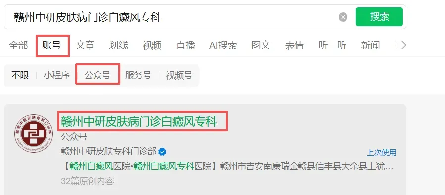 微信搜索“赣州中研皮肤病门诊白癜风专科”公众号并关注,如下图所示: