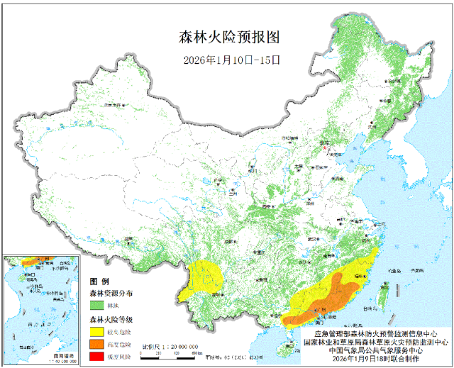 经综合研判,预计2026年1月10日至15日,福建南部、江西东南部、广东东部和南部、广西东南部的部分地区森林火险等级将维持高度危险级别,特发布高森林火险橙色预警,请密切关注火险变化,落实预警响应措施,持续加强火源管控,强化应急准备,有效应对当前严峻的高森林火险形势。