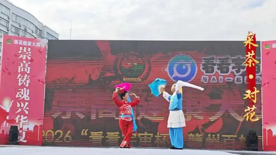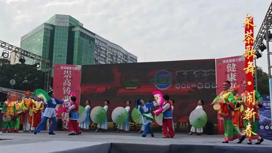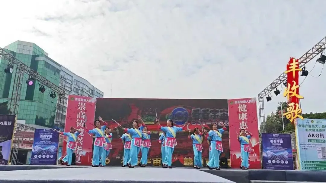 红裙碎花配蓝衫白裙的传统采茶装扮,男女表演者举着彩扇对舞的动作,把赣南采茶调里的灵动俏皮,直接演得活灵活现。