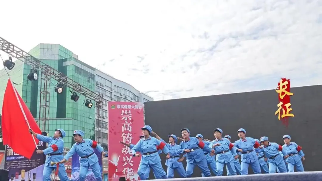 一身利落的蓝色红军装配鲜红袖章,表演者举着红旗迈步的动作,把长征路上的昂扬气场稳稳托住,每一个舒展的姿态里,都裹着让人心里发热的劲儿。