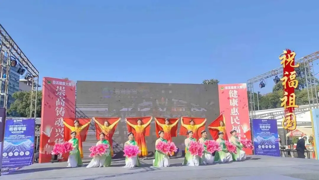 黄绿渐变服饰配粉花道具,表演者展臂的姿态里,把对祖国的祝福裹得热热闹闹。