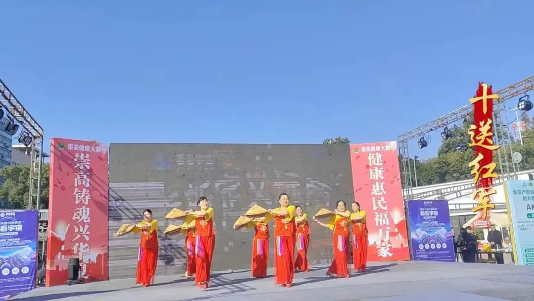 红装搭竹编斗笠,表演者齐步的动作里,藏着《十送红军》里的深情韵味。