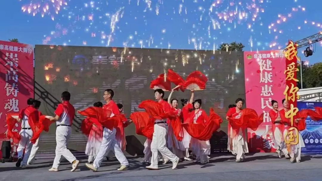 红白服饰配长绸扇,背景烟花衬着舞步,把爱国的热乎劲儿直接拉满。