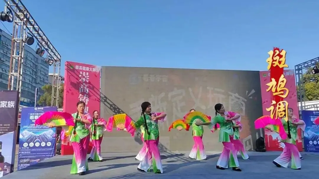 绿粉服饰配彩扇,表演者灵动的舞步里,是赣南《斑鸠调》的鲜活俏皮。