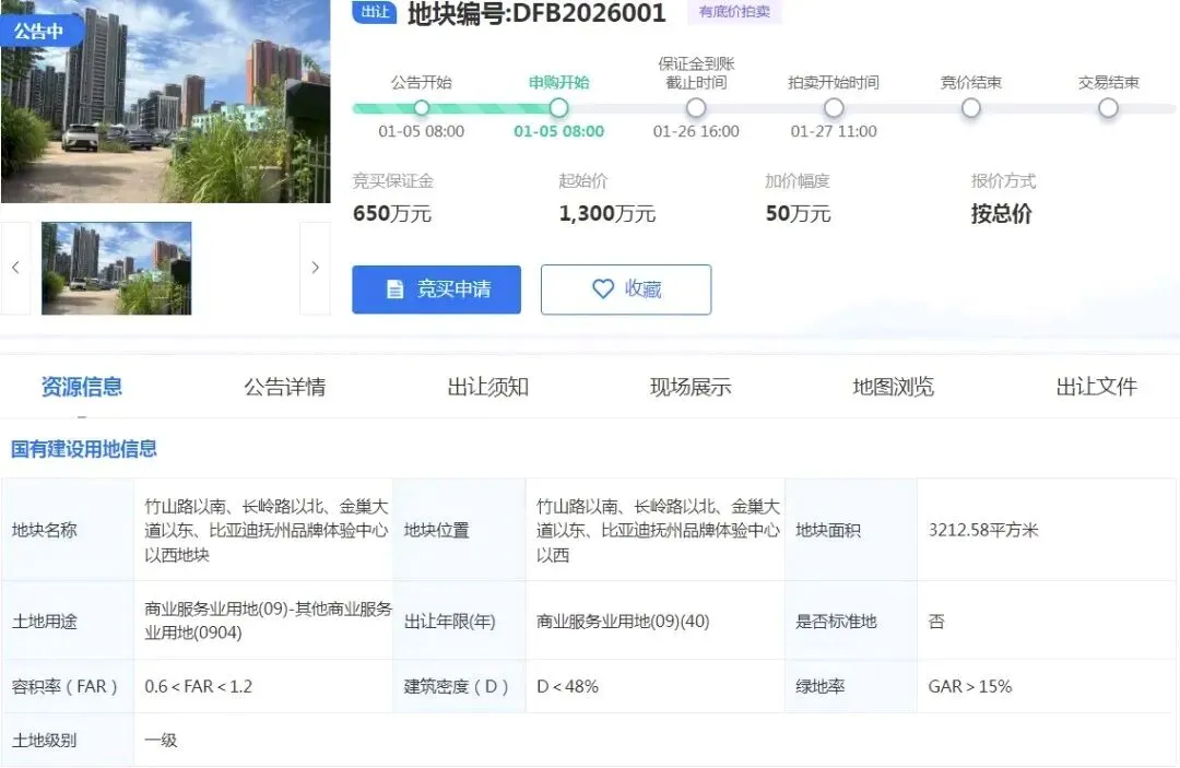 该地块位于竹山路以南、长岭路以北、金巢大道以东、比亚迪抚州品牌体验中心以西,总面积约4.8189亩,起始价为1300万元。