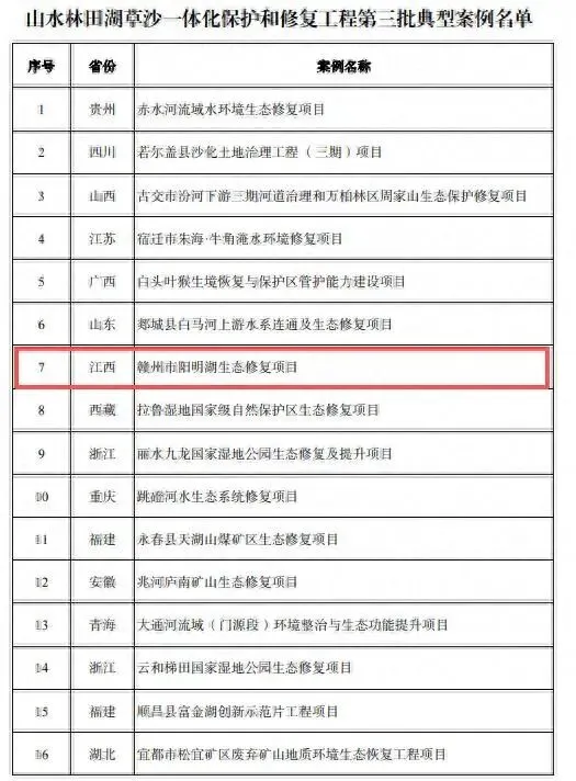 财政部、自然资源部、生态环境部近日在各地推荐申报的基础上,择优选取16个山水林田湖草沙一体化保护和修复工程(以下简称“山水工程”)第三批典型案例,为全国生态保护修复工作再添实践样本。江西省赣州市阳明湖生态修复项目上榜。