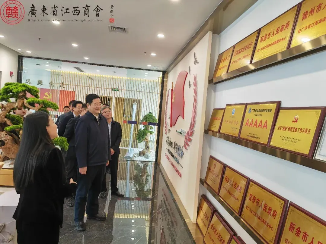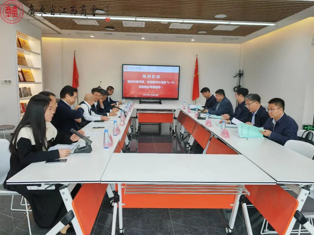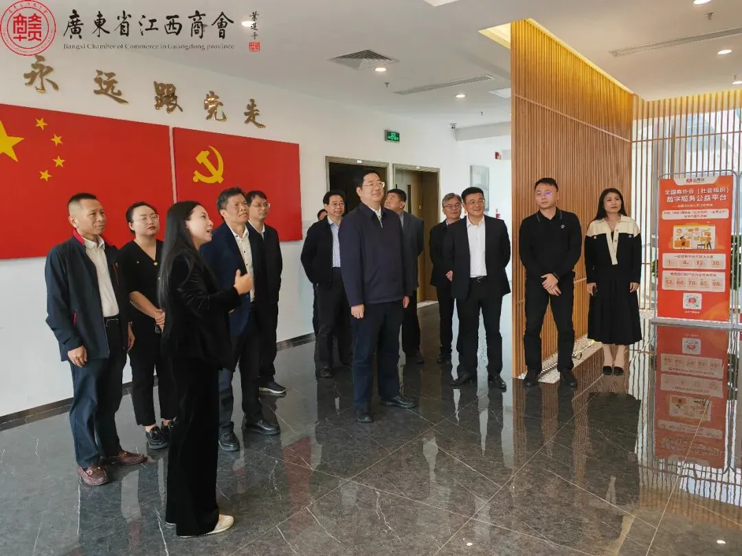12月9日,赣州市委常委、常务副市长胡剑飞一行莅临广东省江西商会调研考察。赣州市章贡区区长刘志怀,赣州市政府驻广东办事处主任王兵,赣州市政府办副主任刘冬良,赣州市工商联副主席、市非公经济党组书记徐永涛等陪同参加。我会会长李希,执行会长丁金水、黄火根,常务副会长庄席福、刘晓鹏、梅文博、邹雅雯,副会长柯思华,执行秘书长王莉等陪同胡剑飞一行先后参观了江西会馆综合体、润都集团、云商会等赣商总部创新集聚区。
