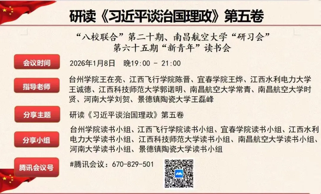 1月8日晚,南昌航空大学“大学生研习会”联合河南大学、台州学院、景德镇陶瓷大学、宜春学院、江西飞行学院、江西水利电力大学、江西科技师范大学等八所高校以线上形式举办“八校联合”第二十期暨“新青年”第六十五期读书会,共同研读《习近平谈治国理政》第五卷,读书会由25级研究生彭丽爱主持。