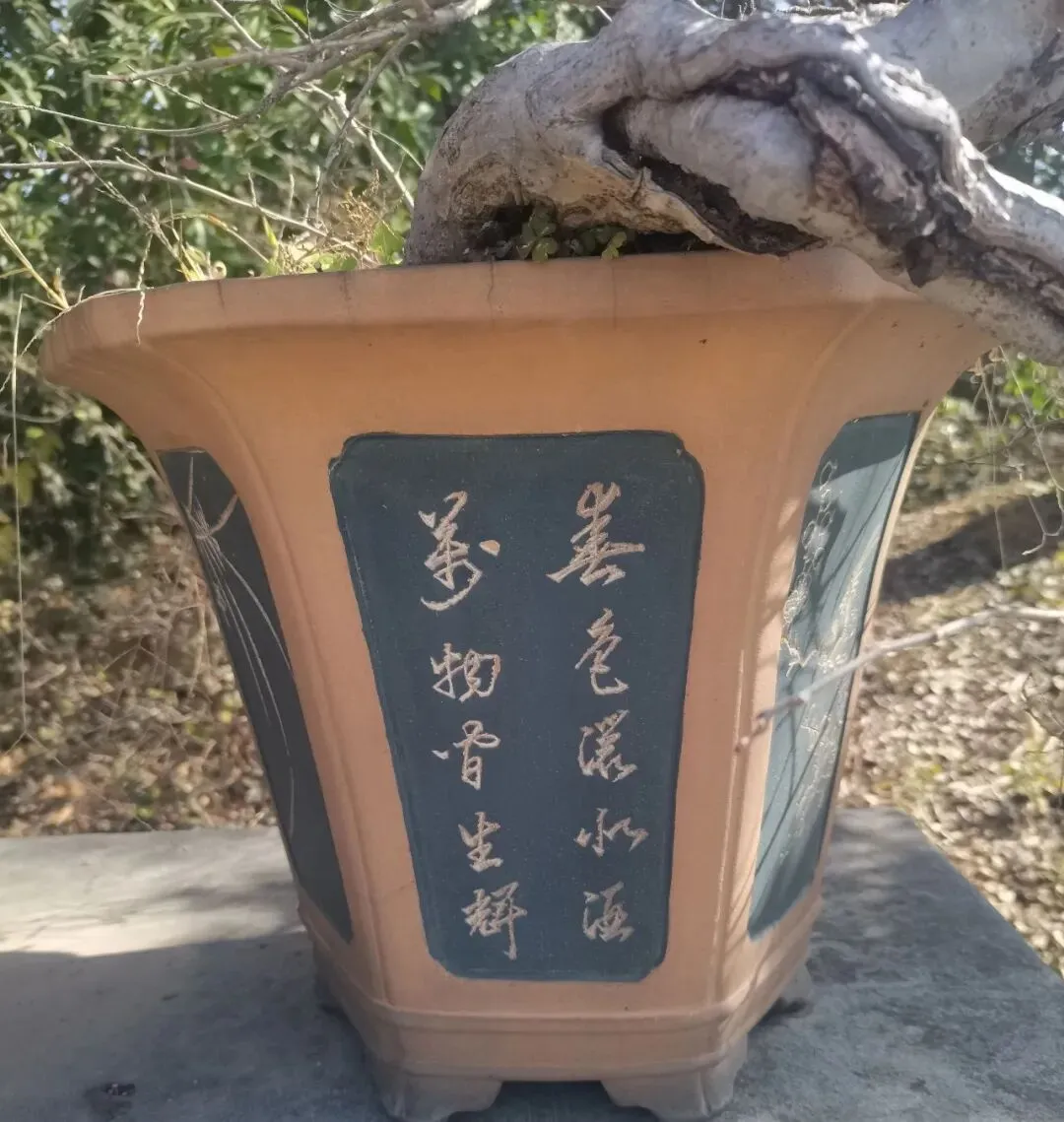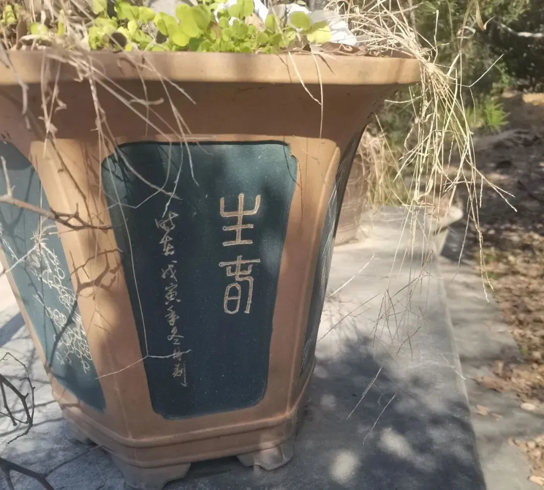 南昌天香园看到一个花盆,花盆上面这行草书看了半天没认全,你试试看?