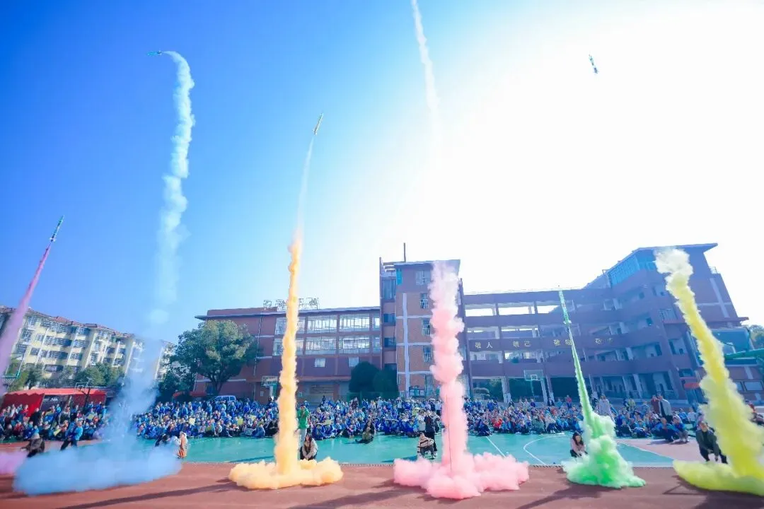最激动人心的时刻——“彩色水火箭”发射,12名师生共同协作完成注压、随着校领导的号令声,3、2、1、发射!6支彩色水火箭直冲云霄,现场掌声、欢呼声此起彼伏,为这场精彩的科学实验秀画上惊叹号,将青春与梦想一同射向了蔚蓝的天空画布。
