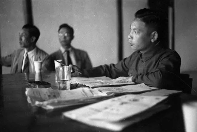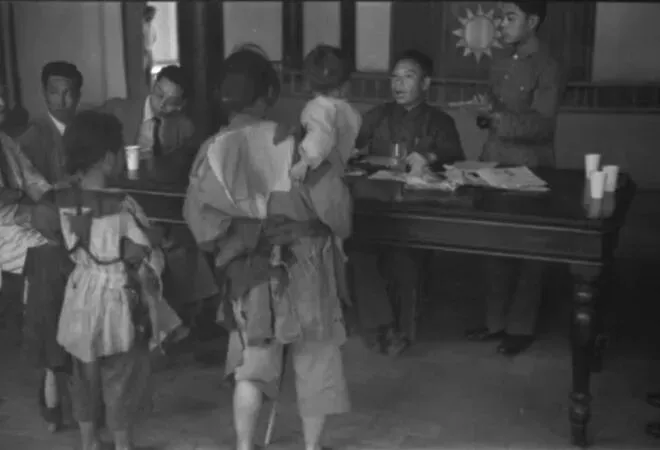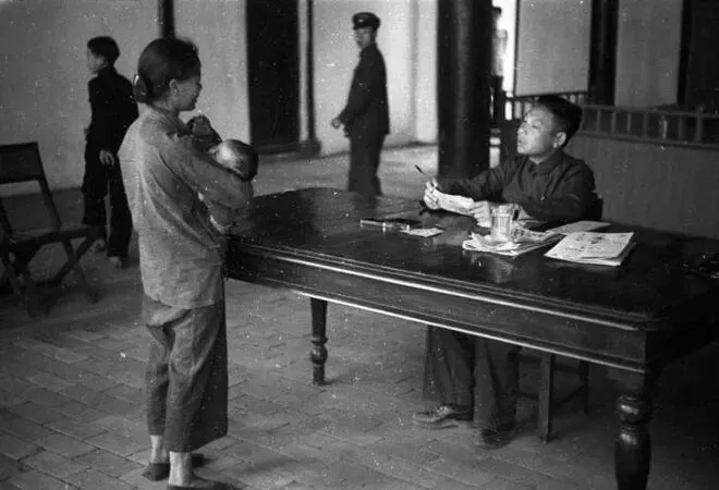 1942年,蒋经国在江西赣州的法庭上审理案件。下面站着的老百姓,不管是大人还是小孩,都是衣衫褴褛,可见当时之困难。Harrison Forman 摄