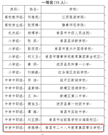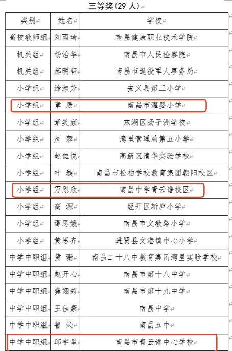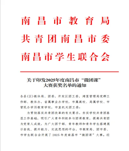 近日,南昌市教育局、共青团南昌市委、南昌市学生联合会联合公布2025年度南昌市“微团课”大赛获奖名单。本次大赛经过专家评委严谨的现场打分与专业评审,青云谱区教师凭借扎实的理论功底与生动的授课表现脱颖而出,4名教师斩获佳绩——分别荣获中学中职组一等奖、中学中职组三等奖及小学组三等奖,充分展现了青云谱区教师队伍优秀的专业素养与育人风采!青云谱区将持续为全区青年教师搭建成长平台,激励广大教师深耕教学、勇于创新,不断提升为党育人的成效,为青少年思想引领工作注入更强劲的动力。来 源:局组织人事股
