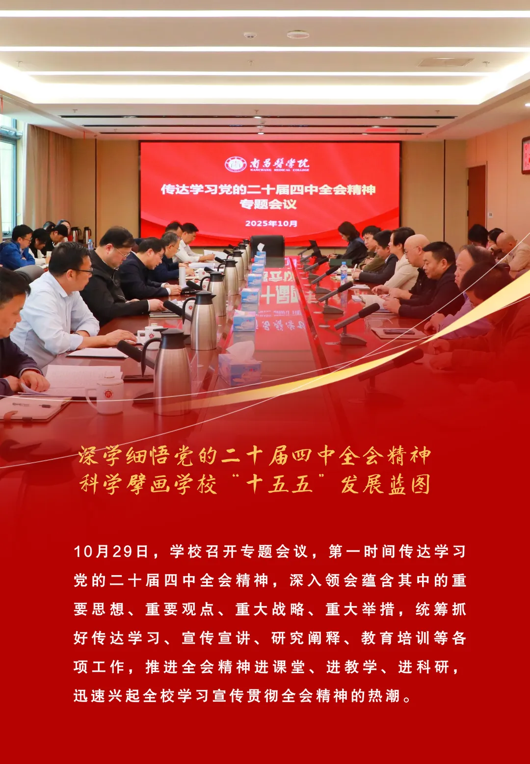 学校党委将学习宣传贯彻党的二十届四中全会精神作为一项重大政治任务,以高度的政治自觉,迅速行动、周密部署,通过组建宣讲团、开展专题培训等多种形式,开展对象化、分众化、互动化宣讲,切实扩大全会精神宣传的覆盖面和影响力,持续推动学习贯彻走深走实、见行见效,为奋力开创高水平医科大学建设新局面注入强大思想动力与实践动能。学校切实将深入学习贯彻党的二十届四中全会精神融入高质量发展,全面总结“十四五”发展成效,科学擘画“十五五”发展规划,凝聚共识,谋定而动,找准方位,精准破局,以更高站位设计学校未来五年发展格局,切实以高水平规划引领学校高质量发展。