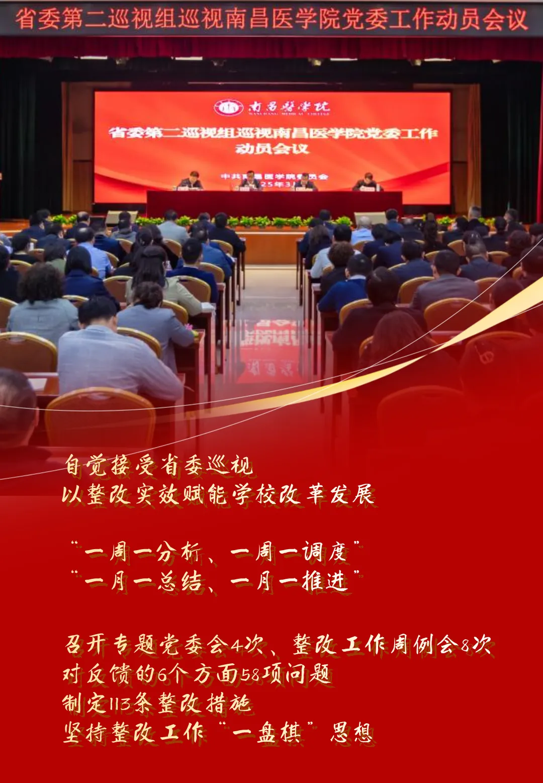 2025年3月24日起,省委第二巡视组对学校开展巡视,学校自觉接受“政治体检”,坚决抓好巡视整改,即知即改、立行立改、全面整改。7月24日收到巡视组反馈的意见后,学校党委坚决扛起省委巡视整改政治责任,对反馈的6个方面58项问题,制定113条整改措施,坚持整改工作“一盘棋”思想,建立巡视整改领导小组办公室周例会、领导小组月推进会制度,完善“一周一分析、一周一调度”“一月一总结、一月一推进”的常态化督导机制。目前已召开专题党委会4次、整改工作周例会8次,以高频调度推动整改任务提速增效,切实以高质量的巡视整改和成果运用,为学校高质量内涵式发展排淤清障、保驾护航。