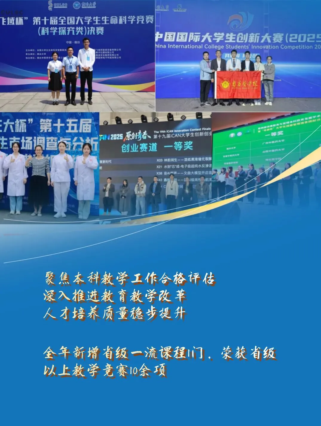 2025年,学校全面推进本科教学工作合格评估迎评促建工作,先后召开专题调度会10余次,邀请专家进校开展专题辅导20余次,与附属医院探索实施人才双聘制度,完成900名专任教师和临床教师“一人一档”建档工作,在全校上下营造“人人知晓评估、人人参与评估、人人贡献评估”的浓厚氛围,为高质量通过评估构筑坚实屏障。学科布局持续优化,学校始终紧密对接全省1269行动计划和行业发展需求,动态优化调整专业布局,成功申报卫生检验与检疫、医养照护与管理2个紧缺专业,课程建设与教学改革不断突破,全年新增省级一流课程1门,荣获省级以上教学竞赛10余项。学生学科竞赛再获佳绩,在“国创赛”“飞域杯”“iCAN大学生创新创业大赛”、全国大学生医学创新大赛暨“一带一路”国际竞赛、“寻康杯”等各类竞赛中荣获全国一等奖及以上奖项,充分展现南医学子扎实的专业素养与创新能力。